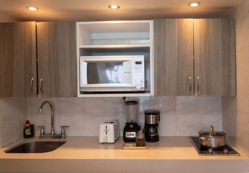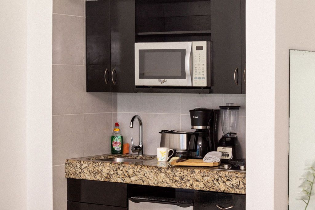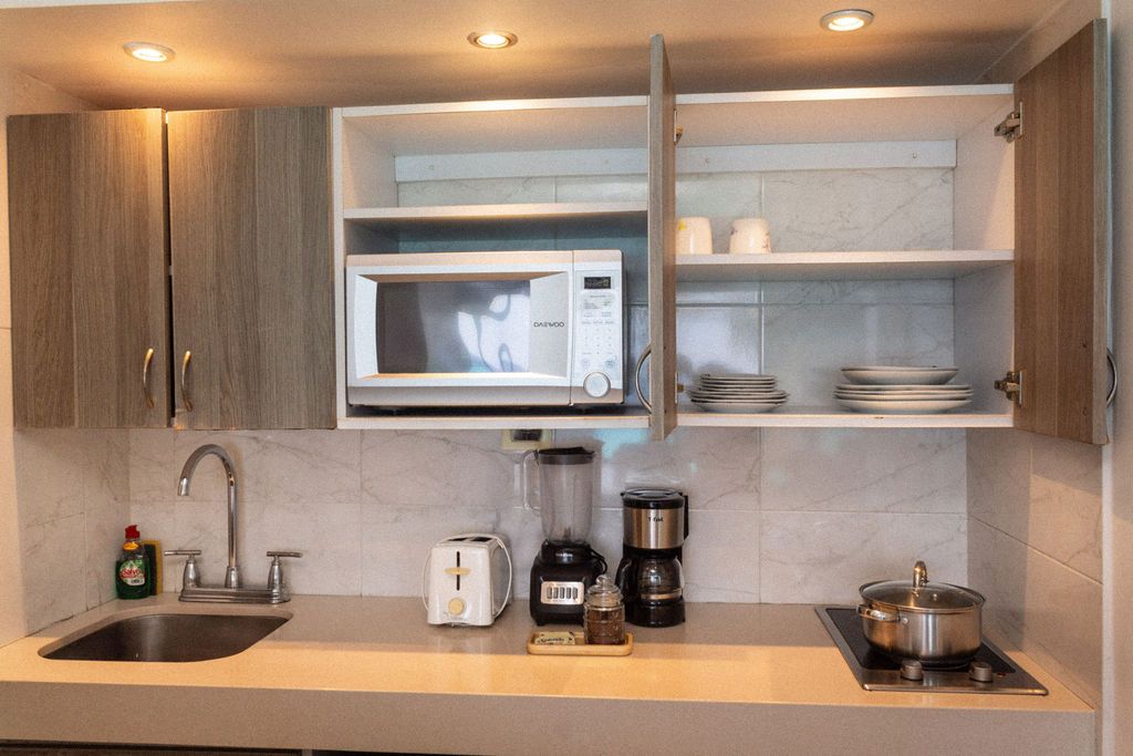 Yaakun Studio es el lugar ideal para quienes buscan más espacio. Además de una cocina en barra y una área para preparar comida, está equipado con un pequeño comedor o sofá cama adicional, que lo convierte en una opción perfecta para estancias cómodas y versátiles frente al mar.